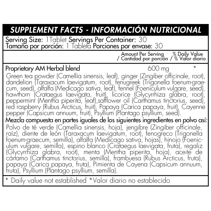 AM-PM contiene la mezcla más completa de ingredientes vegetales con la adición de lactobacillus acidophilus, beneficiosos en la depuración del colon, el hígado, la vesícula biliar y el estómago, con la adición de lactobacillus acidophilus. Esta fórmula desintoxica la sangre y el cuerpo, y proporciona una limpieza completa e integral de todo el sistema hepatobiliar y gastrointestinal, y favorece la correcta absorción de nutrientes, vitaminas y minerales en el intestino delgado.