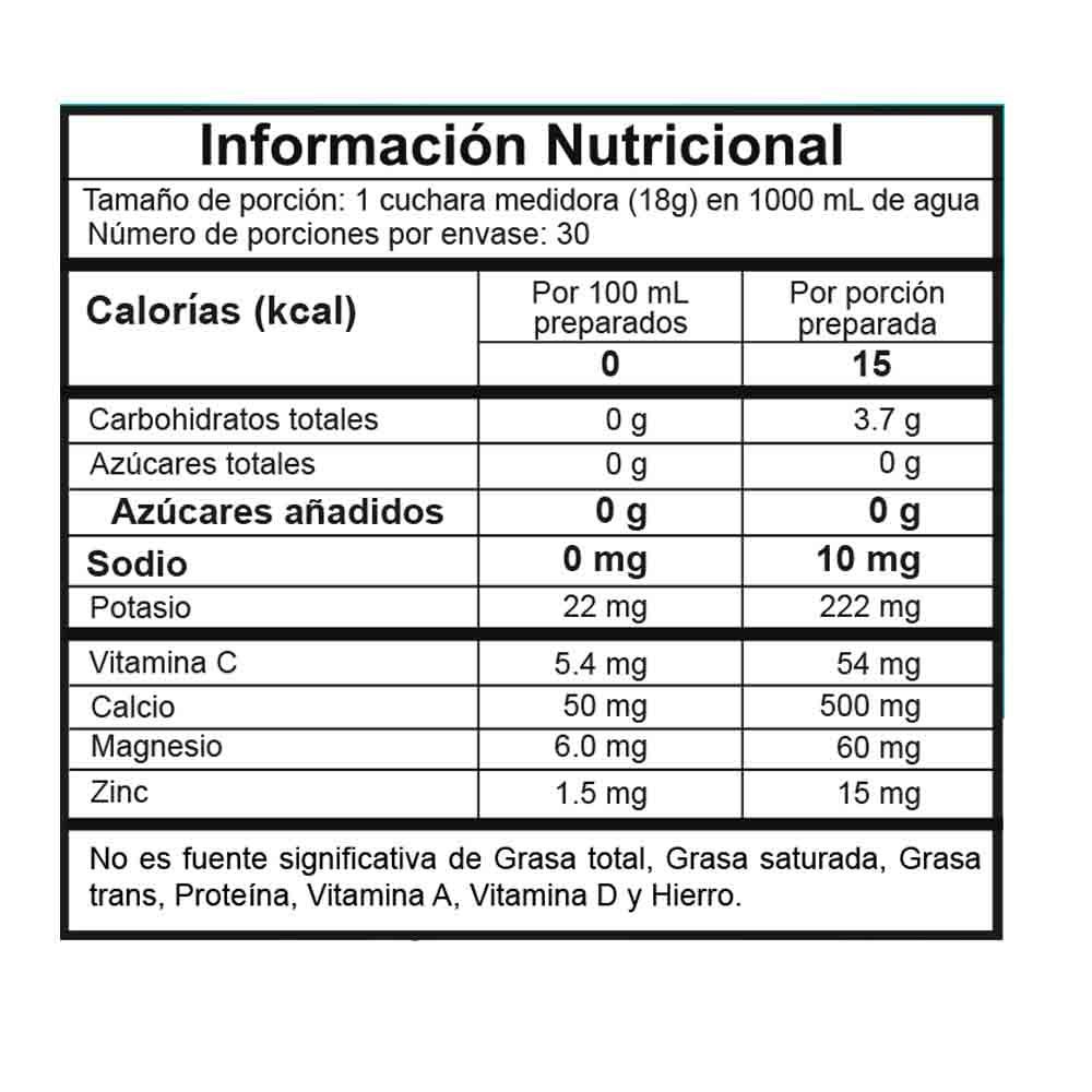 Polvo Deshidratado de Frutos Amarillos, L-Glutamina, L-Leucina, L-Isoleucina, L- Valina, L-Lisina, L-Treonina, L-Histidina, L-Fenilalanina, L-Metionina, L-Triptófano, Carboximetilcelulosa (CMC), Fosfato Tricálcico, Saborizante Idéntico al Natural, Vitamina C (Ácido Ascórbico), Stevia, Citrato de Sodio, Citrato de Potasio, Ácido Málico, Dióxido de Silicio, Colorante (Amarillo), Citrato de Magnesio, Gluconato de Zinc.